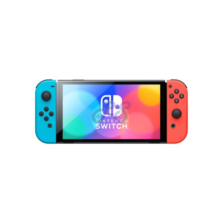 nintendo switch oled with neon blue and neon red joycon joycon neon pink and neon green