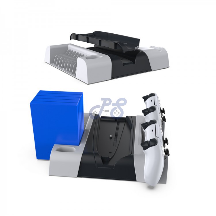 پایه چندکاره PS5 با هر چهار مدل پلی استیشن 5 دیسک خور، دیجیتال، پلی استیشن 5 اسلیم دیسک خور و دیجیتال سازگار است و محصولی مناسب برای جمع آوری و منظم کردن سیستم گیمینگ شما است.این پایه دارای دو فضای مخصوص شارژ دوال سنس، فضای مخصوص نگهداری ریموت پلی استیشن و ۱۰ فضای مخصوص قاب دیسک بازیها است.