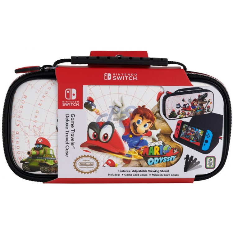 کیف مسافرتی مخصوص کنسول نینتندو سوییچ به شما این امکان را میدهد تا کنسول نینتندو سوییچ را به همراه دو عدد جوی کان، همه جا با خود داشته باشید. شما میتوانید کنسول نینتندو سوییچ را درون این کیف قرار دهید و با جوی کانها بازی کنید و همراه خود هشت عدد کارتریج و چهار عدد میکرو USB را نیز حمل کنید. این کیف مزین به طرح ویژه بازی Super Mario Odyssey است.
